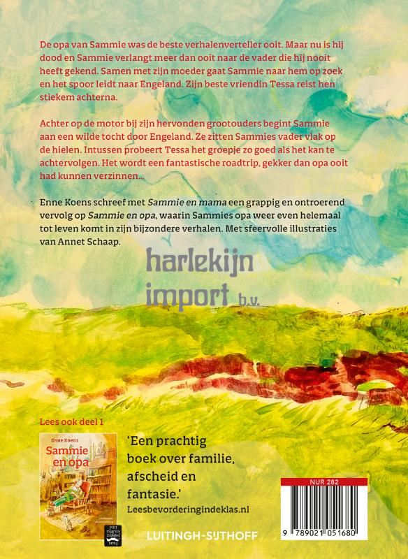 Enne Koens schreef met Sammie en mama een grappig en ontroerend vervolg op Sammie en opa (bekroond met een Vlag en Wimpel van de Griffeljury). Met zwart-witillustraties van Gouden Griffel- en Gouden Penseel-winnares Annet Schaap. De opa van Sammie was de beste verhalenverteller ooit. Maar nu is hij dood en Sammie verlangt meer dan ooit naar de vader die hij nooit heeft gekend. Samen met zijn moeder gaat Sammie naar hem op zoek en het spoor leidt naar Engeland. Zijn beste vriendin Tessa reist hen stiekem achterna. Achter op de motor bij zijn hervonden grootouders begint hij aan een wilde tocht door Engeland. Ze zitten Sammies vader vlak op de hielen. Intussen probeert Tessa het groepje zo goed als het kan te achtervolgen. Het wordt een fantastische roadtrip, gekker dan opa ooit had kunnen verzinnen...