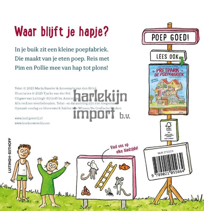 Na het grote (inter)nationale succes van Pretpark de poepfabriek is er nu ook De kleine poepfabriek, een stevig kartonboek voor peuters over de spijsvertering van auteurs Marja Baseler en Annemarie van den Brink en illustrator Tjarko van der Pol. In dit stevige kartonboek volgen peuters de reis die het eten aflegt van mondje tot kontje. Samen met Pollie en Pim ontdekken ze wat er eigenlijk gebeurt in hun lichaam. Want ook in een kleine buik zit een slimme poepfabriek! Maar hoe werkt die nou eigenlijk? Reis mee van hap tot plons, ontdek onderweg allerlei handige tips (Klaar met poepen of plassen? Meteen je handen wassen!) en volg Pim en Pollie op hun ontdekkingstocht in de kleurrijke illustraties van Tjarko van der Pol. 'Een kijkje in ons binnenste, op een grappige en toegankelijke manier.’ Het AD over Pretpark de poepfabriek
