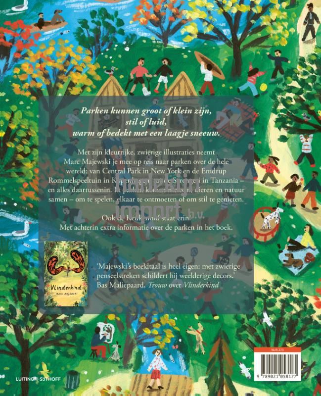 Parken is een prachtig geïllustreerd non-fictieprentenboek van auteur-illustrator Marc Majewski (bekend van Vlinderkind) waarin je parken over de hele wereld ontdekt.Parken kunnen groot of klein zijn, stil of luid, zonnig of bedekt met een laagje sneeuw. Met zijn kleurrijke, zwierige illustraties neemt Marc Majewski je mee op reis naar parken over de hele wereld: van Central Park in New York en de Keukenhof in Nederland, tot de Serengeti in Tanzania – en alles daartussenin. Dit prachtige non-fictieprentenboek is een liefdesverklaring aan parken en de manier waarop ze mensen, dieren en natuur samenbrengen – om te spelen, elkaar te ontmoeten of om stil te genieten. 'Majewski's beeldtaal is heel eigen: met zwierige penseelstreken schildert hij weelderige decors.' Bas Maliepaard, Trouw over Vlinderkind