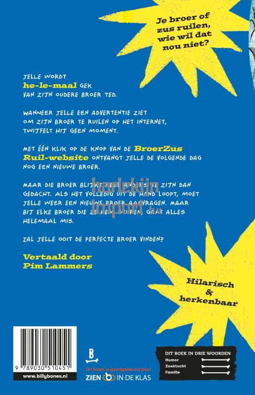 <p>‘Ik kan een nieuwe broer krijgen? Op het internet?’ mompelde Johnny. ‘O grote genadige goden!’ Iedereen droomt weleens van een leukere broer of zus. Maar voor Johnny wordt deze droom opeens een mogelijkheid met www.broederruil.com! Wat is nou een beter idee dan het vervangen van zijn stomme broer Ted door een supercoole broer? Maar het vinden van een supercoole broer is nog niet zo makkelijk, ontdekt Johnny, wanneer Broederruil hem een meute bizarre vervangers stuurt: eerst een zeemeerjongen, dan een broer die door zeekatten is opgevoed en dan ook nog eens de geest van Henry de Achtste! Wie zal de volgende zijn? Opeens lijkt Ted toch niet zo erg meer. Maar kan Johnny hem ooit terugkrijgen?</p> <p>Een hilarisch verhaal voor lezers vanaf 8 jaar – met een ruime bladspiegel voor de beginnende lezers. Perfect voor liefhebbers van Mijn broer is een superheld en de lezers van De Vriezels en Knots!</p>