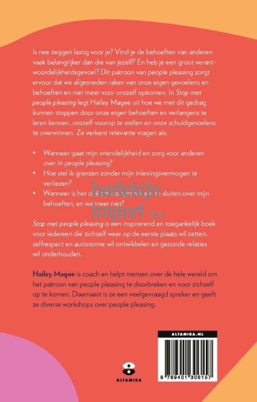 In 'Stop met people pleasing' van Hailey Magee ontdek je hoe je jezelf kunt bevrijden van pleasegedrag en leer je jezelf op de eerste plaats te zetten. Je leert hoe je wél nee kunt leren zeggen, hoe je je niet altijd verantwoordelijk hoeft te voelen voor de verlangens en belangen van anderen en hoe je jezelf niet moet verstoppen om anderen te pleasen. Magee leert ons hoe we met dit gedrag kunnen stoppen door onze eigen behoeften en verlangens te leren kennen, onszelf voorop te stellen en onze schuldgevoelens te overwinnen. Ze verkent vragen zoals: Hoe stel ik grenzen zonder mijn inlevingsvermogen te verliezen? En: Wanneer gaat mijn vriendelijkheid over in people pleasen? 'Stop met people pleasing' is een toegankelijk en inspirerend boek voor iedereen die zichzelf weer op de eerste plaats wil zetten, autonomie en zelfrespect wil ontwikkelen en gezonde relaties wil onderhouden. Van rasechte ja-knikkers tot vergevorderde people pleasers: met 'Stop met people pleasing' leert iedereen die té veel pleast dit gedrag voor eens en altijd in de ban te doen.