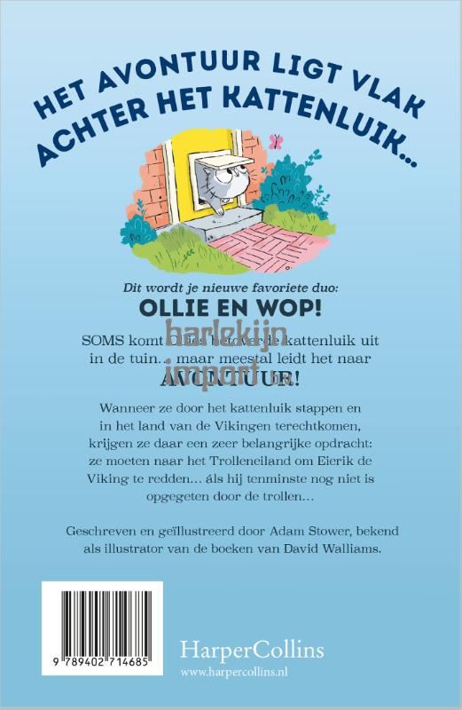 Ollie de Viking van Adam Stower is een hilarisch avontuur over een kat en een konijn die door een betoverd kattenluik gaan.Dit wordt je nieuwe favoriete duo: Ollie en Wop! Soms komt Ollies betoverde kattenluik uit in de tuin… maar meestal leidt het naar avontuur!Wanneer ze door het kattenluik stappen en in het land van de Vikingen terechtkomen, krijgen ze daar een zeer belangrijke opdracht: ze moeten naar het Trolleneiland om Eierik de Viking te redden… áls hij tenminste nog niet is opgegeten door de trollen…Ollie de Viking is de start van een geweldige nieuwe kinderboekenserie, met fantastische illustraties van Adam Stower.