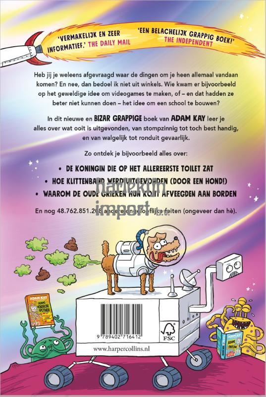 Adams uitstekende uitvindingen, het derde boek in Adam Kay’s internationale bestsellerserie, is geweldig grappig en leerzaam voor het hele gezin.Heb jij je weleens afgevraagd waar de dingen om je heen allemaal vandaan komen? En nee, dan bedoel ik niet uit winkels. Wie kwam er bijvoorbeeld op het geweldige idee om videogames te maken, of – en dat hadden ze beter niet kunnen doen – het idee om een school te bouwen?In dit nieuwe en grappige boek van Adam Kay leer je alles over wat ooit is uitgevonden, van stompzinnig tot toch best handig, en van walgelijk tot ronduit gevaarlijk. Zo ontdek je bijvoorbeeld alles over:- de koningin die op het allereerste toilet zat- hoe klittenband werd uitgevonden (door een hond!)- waarom de oude Grieken hun kont afveegden aan bordenEn nog 48.762.851.208 andere ongelooflijke feiten (ongeveer dan hè).Over eerder werk:‘Met zijn unieke stijl weet Adam Kay de juiste toon te treffen om de aandacht van de lezer vast te houden: met humor, overdrijvingen, smerige details, woordspelingen en grappen.’ NBD Biblion‘Een belachelijk grappig boek dat iedereen tegelijkertijd zal verrukken, uitdagen en onderwijzen.’ The Independent