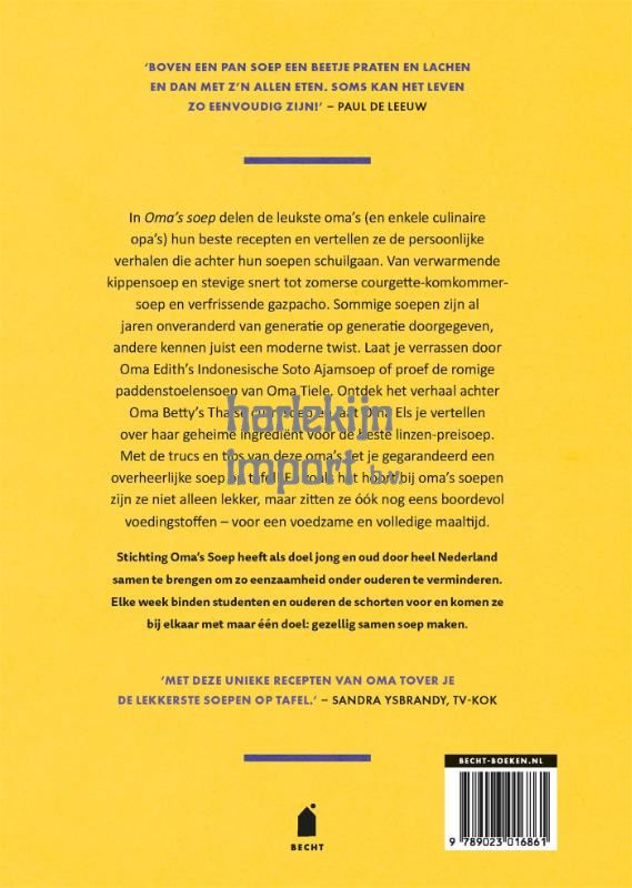Soep verwarmt, soep is nostalgie en soep verbindt. In ‘Oma’s soep’ delen de leukste oma’s hun favoriete recepten en hun persoonlijke verhalen bij deze soepen. Elke soep zit boordevol voedingstoffen voor een voedzame en volledige maaltijd voor iedereen. Stichting Oma’s Soep heeft als doel jong en oud door heel Nederland samen te brengen om zo de strijd tegen eenzaamheid te overwinnen. Ze organiseren kookdagen waar studenten en ouderen samen de heerlijkste soepen koken, die daarna worden bezorgd bij eenzame ouderen thuis. In dit kookboek zijn de beste 50 soeprecepten gebundeld. Zo kan iedereen genieten van een romige asperge-crèmesoep, verwarmende Joodse kippensoep, Turkse Ash resteh-soep of Franse Vichy soise. Oma’s soep is natuurlijk altijd het lekkerst! Van elk verkocht kookboek wordt 1 euro gedoneerd aan Stichting Oma’s Soep.