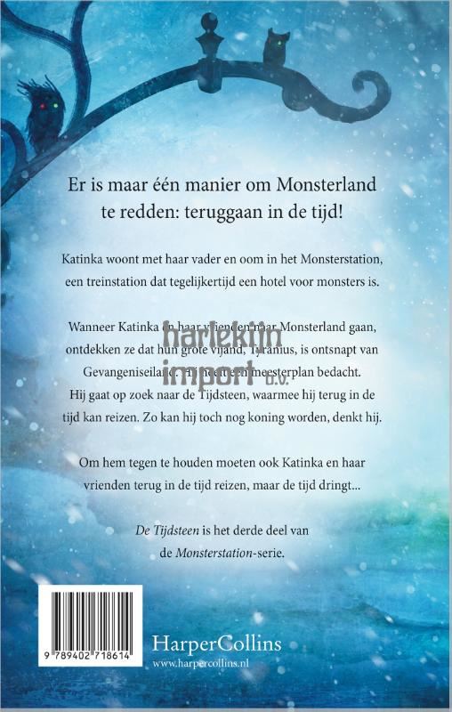 Nieuwe avonturen van Katinka en haar vrienden van de Kierewietclub in De Tijdsteen, het derde deel van de Monsterstation-serie van Johan Elfner. Katinka en haar vrienden willen naar Monsterland om Kerstmis te vieren. Ze weten alleen niet dat hun grote vijand Tyranius is ontsnapt van Gevangeniseiland. Tyranius is nog steeds vastbesloten om Monsterland te veroveren en daarvoor heeft hij een meesterplan bedacht. Hij gaat op zoek naar de Tijdsteen, waarmee hij terug in de tijd kan reizen. Zo kan hij toch nog de koningin vermoorden en zelf koning worden! Om Tyranius tegen te houden moeten ook Katinka en haar vrienden terug in de tijd reizen, maar ze moeten opschieten... ‘Origineel, fantasierijk, spannend, lief en grappig; ik had dit graag willen lezen toen ik nog een kind was.’ Remco Houtepen, Boekhandel Libris Venstra