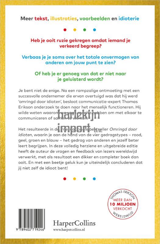 Eenmalige luxe-uitgave van de bestseller Omringd door idioten van Thomas Erikson. Deze editie is volledig herzien en uitgebreid: meer tekst, meer illustraties, meer voorbeelden en meer idioterie. Heb je ooit ruzie gekregen omdat iemand je verkeerd begreep? Verbaas je je soms over het totale onvermogen van anderen om jouw punt te zien? Of heb je er genoeg van dat er niet naar je geluisterd wordt? Je bent niet de enige. Na een rampzalige ontmoeting met een succesvolle ondernemer die ervan overtuigd was dat hij werd ‘omringd door idioten’, besloot communicatie-expert Thomas Erikson onderzoek te doen naar het menselijk functioneren om antwoord te krijgen op de vraag waarom we vaak moeite hebben om met elkaar te communiceren of samen te werken. Het resulteerde in de internationale bestseller Omringd door idioten, waarin je aan de hand van de vier gedragstypes – rood, geel, groen en blauw – het gedrag van anderen en jezelf beter leert begrijpen. In deze volledig herziene en uitgebreide editie heeft de auteur de vragen en feedback van lezers wereldwijd verwerkt, met als resultaat een dikker en completer boek dan ooit. En met een beetje geluk kun je uiteindelijk concluderen dat jij niet zelf de idioot bent!