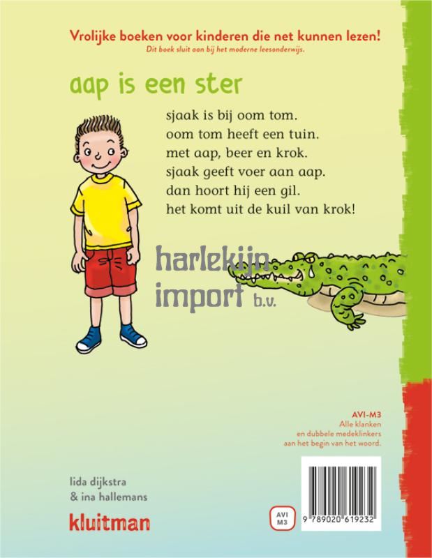 Sjaak is een dagje vrij en helpt zijn oom in de dierentuin. Tijdens het voeren van Aap horen ze opeens een hele harde gil. Er is een jongen in het hok van de krokodil gevallen! Ze gaan er snel op af, maar vergeten het hok van Aap dicht te doen. Aap schiet te hulp en is de held van de dag. In de nieuwe Kluitman-serie lees lees lees kunnen kinderen na drie weken leesonderwijs al hun eerste boek lezen. Vaak is AVI Start nog te moeilijk, maar met deze serie kunnen ze toch al hun eerste leesmeters maken. De auteurs zijn erin geslaagd om op dit lage leesniveau toch grappige, spannende en boeiende verhalen te schrijven. Zo ervaren beginnende lezers al na een paar weken leesonderwijs hoe leuk lezen is. Lees lees lees sluit perfect aan bij alle gangbare leesmethodes. De serie kent drie niveaus, waarbij de betreffende leesmoeilijkheden aansluiten bij de toenemende leesvaardigheid.