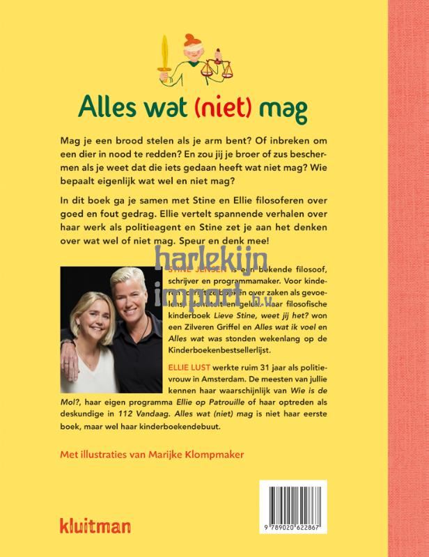 Mag je een brood stelen als je arm bent? Of inbreken om een dier in nood te redden? Mag je een straf uitzitten voor een familielid? Dat zijn lastige vragen. Van een strafbaar feit spreek je als je iets doet wat niet mag volgens de wet. Maar of je je goed of juist slecht gedraagt, wordt niet alleen door de wet bepaald. In dit boek laten Stine Jensen en Ellie Lust de lezer nadenken over hoe ingewikkeld het soms kan zijn om het goede te doen en om te weten wat dat goede dan is en waarom. De prachtige illustraties zijn weer van Marijke Klompmaker (o.a. -Alles wat ik voel en Alles wat was). Een unieke samenwerking tussen drie vrouwen die ieder de helft zijn van een eeneiige tweeling!