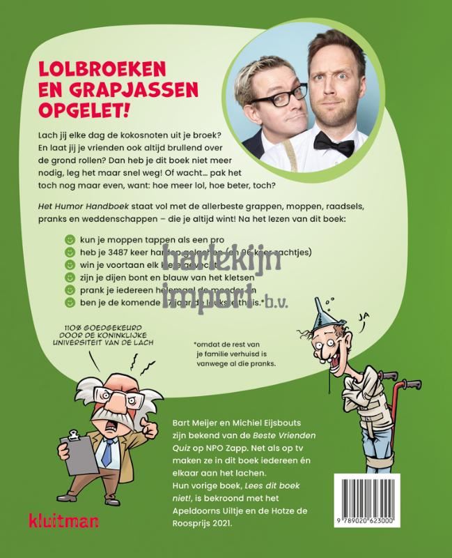 Lach jij elke dag de kokosnoten uit je broek? En laat jij je vrienden ook altijd brullend over de grond rollen? Dan heb je dit boek niet meer nodig, leg het maar snel weg! Of wacht… pak het toch nog maar even, want: hoe meer lol, hoe beter, toch? Het Humor Handboek staat vol met de allerbeste grappen, moppen, raadsels, pranks en weddenschappen – die je altijd wint! Na het lezen van dit boek kun je moppen tappen als een pro, heb je 3487 keer hardop gelachen (en 96 keer zachtjes), win je voortaan elk kietelgevecht, zijn je dijen bont en blauw van het kletsen, prank je iedereen helemaal de moeder en ben je de komende 37 jaar de leukste thuis.