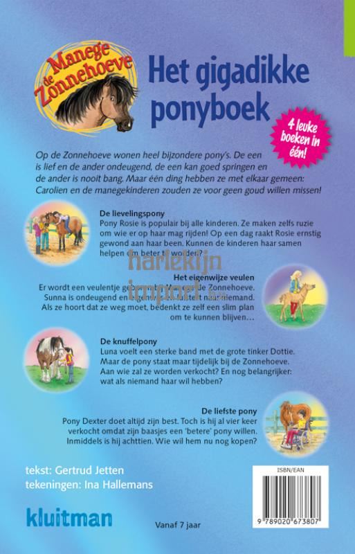 ‘Manege de Zonnehoeve’ is een van de meest succesvolle paardenseries in Nederland en België. Gertrud Jetten weet precies de juiste snaar te raken door te schrijven vanuit de pony’s zelf. Bovendien zijn de boeken vrolijk en kleurrijk geïllustreerd door Ina Hallemans. In deze mooie bind-up zitten de populaire titels De lievelingspony, Het eigenwijze veulen, De knuffelpony en De liefste pony. Zo kunnen Zonnehoeve-fans lekker veel lezen voor een aantrekkelijke prijs. En welke paardenfan wil dat nou niet?