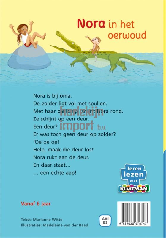 Nora mag van oma op zolder spelen. Maar net als ze een leuk boek wil gaan lezen, hoort ze een vreemd geluid. Het komt van achter de deur. De deur? Er is helemaal geen deur op zolder! Als Nora hem opent, staat ze oog in oog met mama aap, die haar kleintje kwijt is. Voor ze het weet, slingert Nora rond in het oerwoud en moet ze een krokodil te slim af zijn om het kleine aapje te redden.