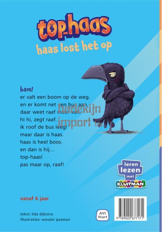 Het is warm en Daan kan niet slapen. Daarom vertelt zijn vader hem een spannend verhaal over zijn knuffel haas. Die verandert in Top-haas – een echte superheld – als dat nodig is. Zo krijgt Raaf niet de kans om de dieren in de bus te bestelen of de bank te beroven. Actie en avontuur op AVI-start-niveau in deze nieuwe serie van Lida Dijkstra. Met schitterende illustraties van Wouter Pasman.