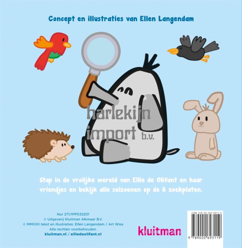 Ellie de Olifant is nieuwsgierig naar haar omgeving en daardoor beleeft ze de grappigste en soms bizarre momenten. Met haar speciale slurf kan ze wonderen laten gebeuren. Ellie de Olifant is bekend van de animatieserie op NPO Zappelin en van YouTube. Met het begin van haar eigen boekenserie wordt de wereld van Ellie de Olifant nu steeds groter! Ontdek de seizoenen is een kartonboek waarin veel te zien is. Kinderen kunnen kijken, zoeken en ontdekken op de acht zoekplaten. Zo ontdekken ze niet alleen de seizoenen, maar ook de geweldige en magische wereld van Ellie de Olifant vol fantasie en grappige momenten. Er zullen nog veel meer boeken volgen!