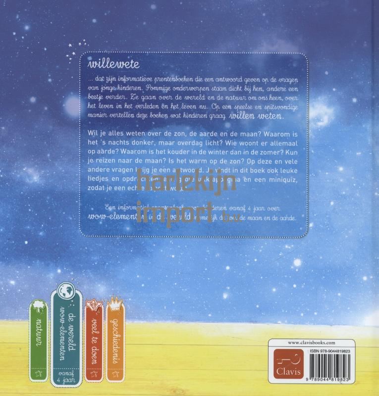 De aarde is een wonderlijke planeet. Van hieruit zien we de zon en de maan vaak aan de hemel. De zon is een ster. Zij geeft ons licht en warmte en is onontbeerlijk voor het leven op aarde. De maan draait rond de aarde en hoewel ze niet zo belangrijk is als de zon, is de maan toch ook heel bijzonder. Alles wat je over de aarde, de zon en de maan wilt weten, vind je in dit boek.