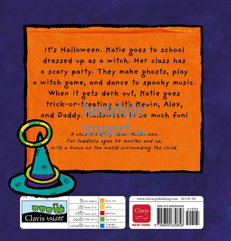 It’s Halloween. Katie goes to school dressed up as a witch. Her class has a scary party. They make ghosts, play a witch game, and dance to spooky music. When it gets dark out, Katie goes trick-or-treating with Kevin, Alex, and Daddy. Halloween is so much fun! A cheerful story about Halloween. For toddlers ages 24 months and up, with a focus on the world surrounding the child.