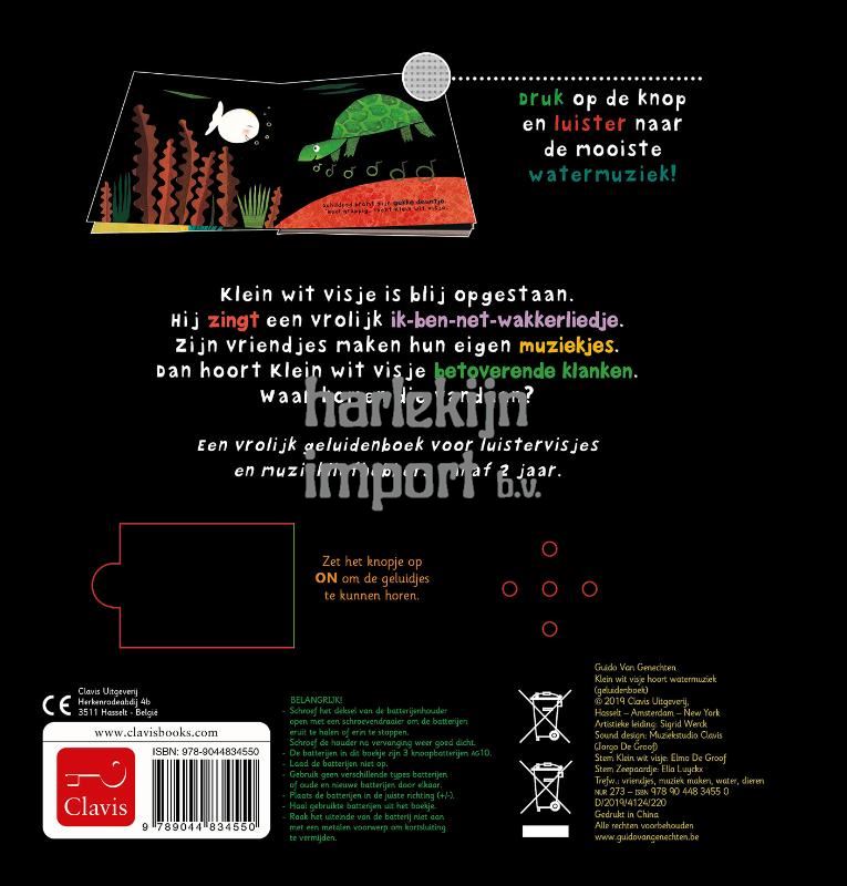 Een vrolijk geluidenboek voor luistervisjes en muziekliefhebbers vanaf 2 jaar. Klein wit visje is blij opgestaan. Hij zingt een vrolijk ik-ben-net-wakkerliedje. Zijn vriendjes maken hun eigen muziekjes. Dan hoort Klein wit visje betoverende klanken. Waar komen die vandaan?