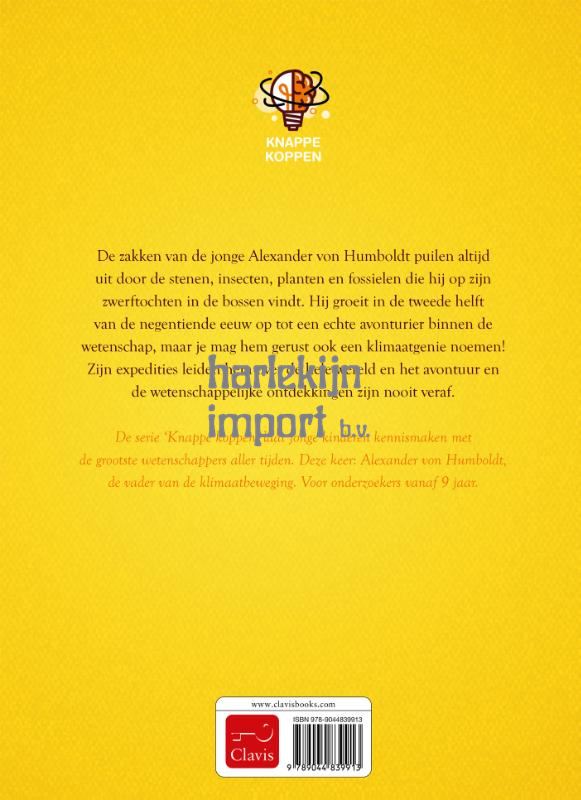 De serie ‘Knappe koppen’ laat jonge kinderen kennismaken met de grootste wetenschappers aller tijden. Deze keer: Alexander von Humboldt, de vader van de klimaatbeweging. Voor onderzoekers vanaf 9 jaar. De zakken van de jonge Alexander von Humboldt puilen altijd uit door de stenen, insecten, planten en fossielen die hij op zijn zwerftochten in de bossen vindt. Hij groeit in de tweede helft van de negentiende eeuw op tot een echte avonturier binnen de wetenschap, maar je mag hem gerust ook een klimaatgenie noemen! Zijn expedities leiden hem over de hele wereld en het avontuur en de wetenschappelijke ontdekkingen zijn nooit veraf.