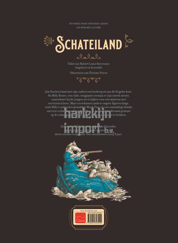 Een nieuwe kijk op deze avontuurlijke klassieker, waarbij de personages in de illustraties als dieren worden voorgesteld. Voor zeeschuimers vanaf 8 jaar. Jim Hawkins baat met zijn ouders een herberg uit aan de Engelse kust. Als Billy Bones, een oude, zwijgzame zeeman er zijn intrek neemt, waarschuwt hij de jongen uit te kijken voor een matroos met een houten been. Maar eerst komen andere ongure figuren langs, zoals Billy’s oude scheepsmakker Black Dog, en een wanstaltige blinde met een verband rond zijn hoofd … Ze hebben het allemaal gemunt op de schatkaart die Billy Bones in zijn bezit blijkt te hebben.