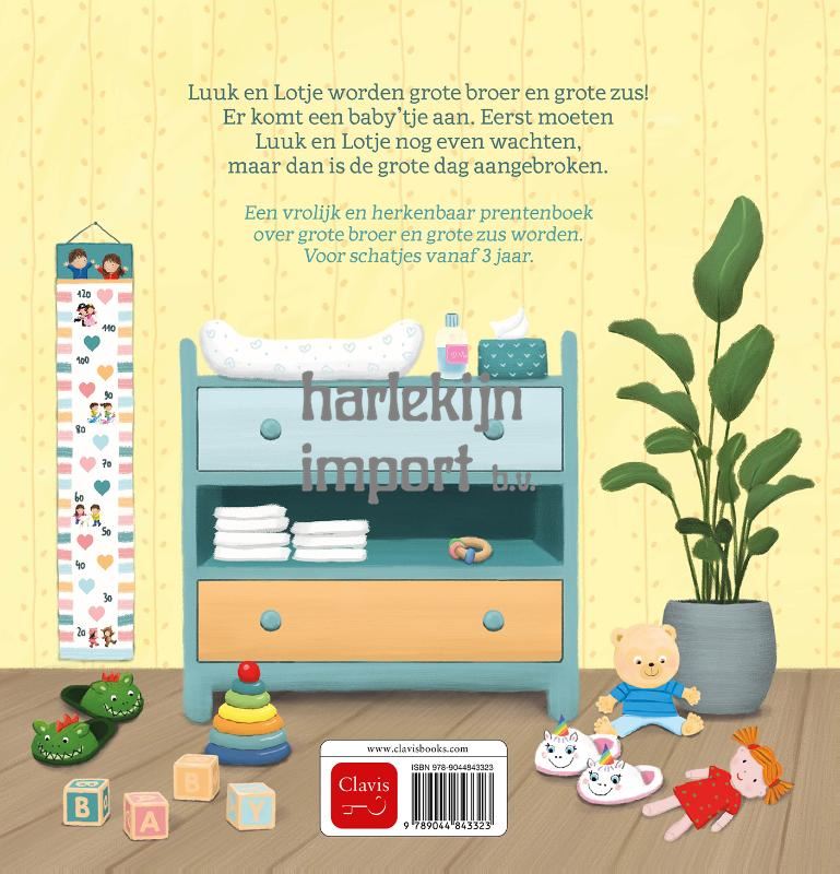 Luuk en Lotje worden grote broer en grote zus! Er komt een baby’tje aan. Eerst moeten Luuk en Lotje nog even wachten, maar dan is de grote dag aangebroken. Een vrolijk en herkenbaar prentenboek over grote broer en grote zus worden. Voor schatjes vanaf 3 jaar.