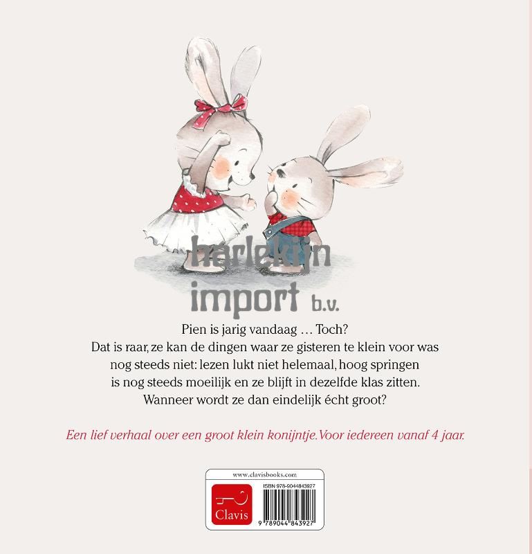 Pien is jarig vandaag … Toch? Dat is raar, ze kan de dingen waar ze gisteren te klein voor was nog steeds niet: lezen lukt niet helemaal, hoog springen is nog steeds moeilijk en ze blijft in dezelfde klas zitten. Wanneer wordt ze dan eindelijk écht groot? Een lief verhaal over een groot klein konijntje. Voor iedereen vanaf 4 jaar.