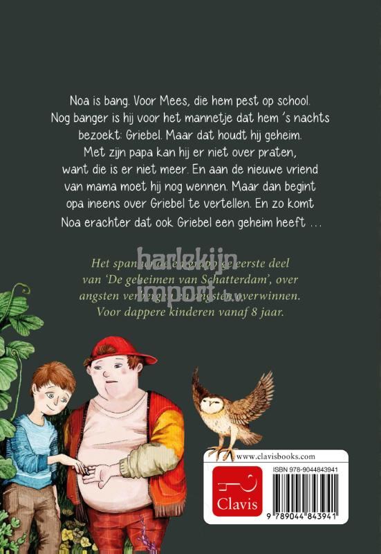 Noa is bang. Voor Mees, die hem pest op school. Nog banger is hij voor het mannetje dat hem ’s nachts bezoekt: Griebel. Maar dat houdt hij geheim. Met zijn papa kan hij er niet over praten, want die is er niet meer. En aan de nieuwe vriend van mama moet hij nog wennen. Maar dan begint opa ineens over Griebel te vertellen. En zo komt Noa erachter dat ook Griebel een geheim heeft … Het spannende en grappige eerste deel van ‘De geheimen van Schatterdam’, over angsten verbergen en angsten overwinnen. Voor dappere kinderen vanaf 8 jaar.