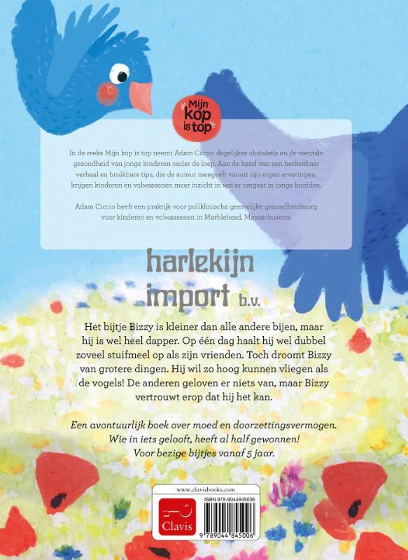 Het bijtje Bizzy is kleiner dan alle andere bijen, maar hij is wel heel dapper. Op één dag haalt hij wel dubbel zoveel stuifmeel op als zijn vrienden. Maar Bizzy droomt van grotere dingen. Hij wil zo hoog kunnen vliegen als de vogels! De anderen geloven er niets van, maar Bizzy vertrouwt erop dat hij het kan. Een avontuurlijk boek over moed en doorzettingsvermogen. Wie in iets gelooft, heeft al half gewonnen! Voor bezige bijtjes vanaf 5 jaar. Mijn kop is top In de reeks Mijn kop is top neemt Adam Ciccio dagelijkse obstakels en de mentale gezondheid van jonge kinderen onder de loep. Aan de hand van een herkenbaar verhaal en bruikbare tips, die de auteur meegeeft vanuit zijn eigen ervaringen, krijgen kinderen en volwassenen meer inzicht in wat er omgaat in jonge hoofden. Adam Ciccio heeft een praktijk voor poliklinische geestelijke gezondheidszorg voor kinderen en volwassenen in Marblehead, Massachusetts.