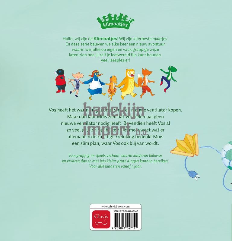 Hallo, wij zijn de Klimaatjes! Wij zijn allerbeste maatjes. In deze serie beleven we elke keer een nieuw avontuur waarin we jullie op eigen en vaak grappige wijze laten zien hoe jij zelf je leefwereld fijn kunt houden. Veel leesplezier! Vos heeft het warm en gaat daarom een nieuwe ventilator kopen. Bij thuiskomst laat Muis zien dat Vos helemaal geen nieuwe ventilator nodig heeft. Bovendien heeft Vos al zo veel spullen dat hij zelf niet meer weet wat er allemaal in de kast ligt. Gelukkig bedenkt Muis een slim plan, waar Vos ook blij van wordt. Een grappig en speels verhaal waarin kinderen beleven en ervaren dat ze met iets kleins grote dingen kunnen bereiken. Voor alle kinderen vanaf 5 jaar.