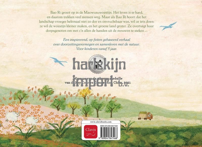 Bao Ri groeit op in de Maowusuwoestijn. Het leven is er hard, en daarom trekken veel mensen weg. Maar als Bao Ri hoort dat het landschap vroeger helemaal niet zo dor en onvruchtbaar was, wil ze iets doen: ze wil de woestijn kleiner maken, en het groene land groter. Ze overtuigt haar dorpsgenoten om met z’n allen de handen uit de mouwen te steken … Een inspirerend, op feiten gebaseerd verhaal over doorzettingsvermogen en samenleven met de natuur. Voor kinderen vanaf 5 jaar.