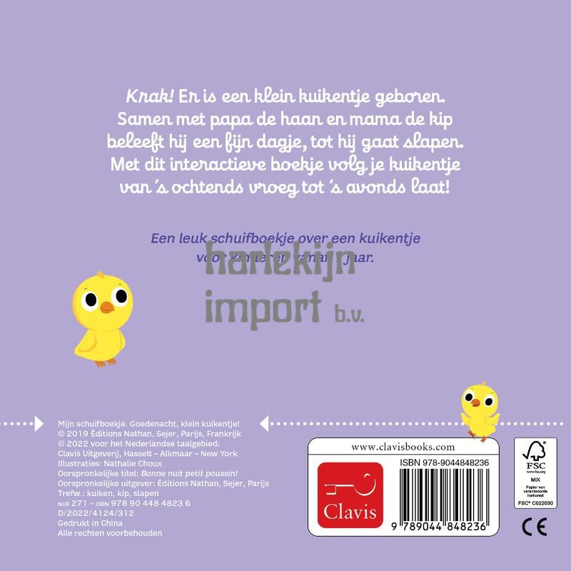 Krak! Er is een klein kuikentje geboren. Samen met papa de haan en mama de kip beleeft hij een fijn dagje, tot hij gaat slapen. Met dit interactieve boekje volg je kuikentje van ’s ochtends vroeg tot ’s avonds laat! Een leuk schuifboekje over een kuikentje voor kinderen vanaf 1 jaar.