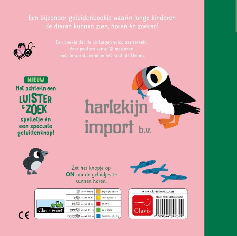Een bijzonder geluidenboekje waarin jonge kinderen de dieren kunnen zien, horen én zoeken! Een boekje dat de zintuigen volop aanspreekt. Voor peuters vanaf 12 maanden, met de wereld rondom het kind als thema.
