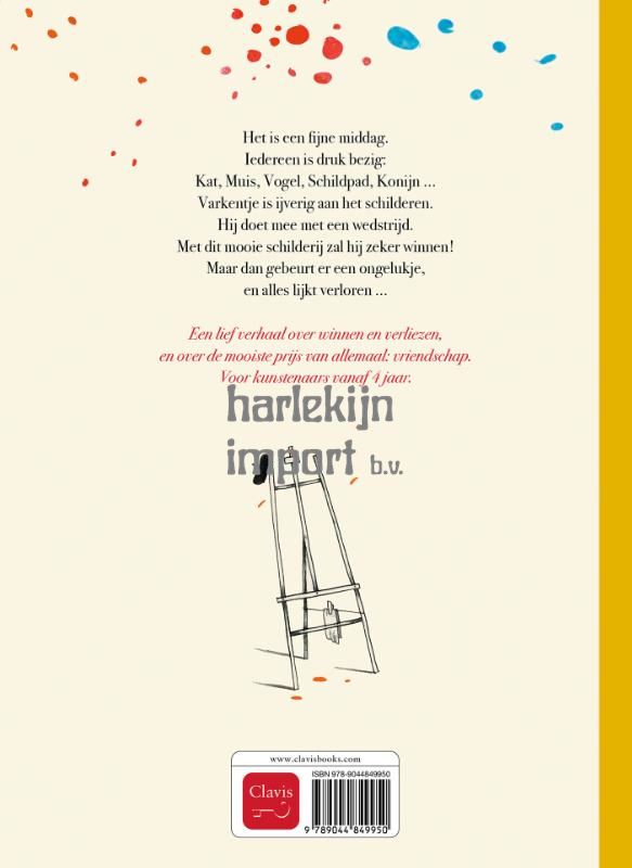 Het is een fijne middag. Iedereen is druk bezig: Kat, Muis, Vogel, Schildpad, Konijn … Varkentje is ijverig aan het schilderen. Hij doet mee met een wedstrijd. Met dit mooie schilderij zal hij zeker winnen! Maar dan gebeurt er een ongelukje, en alles lijkt verloren … Een lief verhaal over winnen en verliezen, en over de mooiste prijs van allemaal: vriendschap. Voor kunstenaars vanaf 4 jaar.