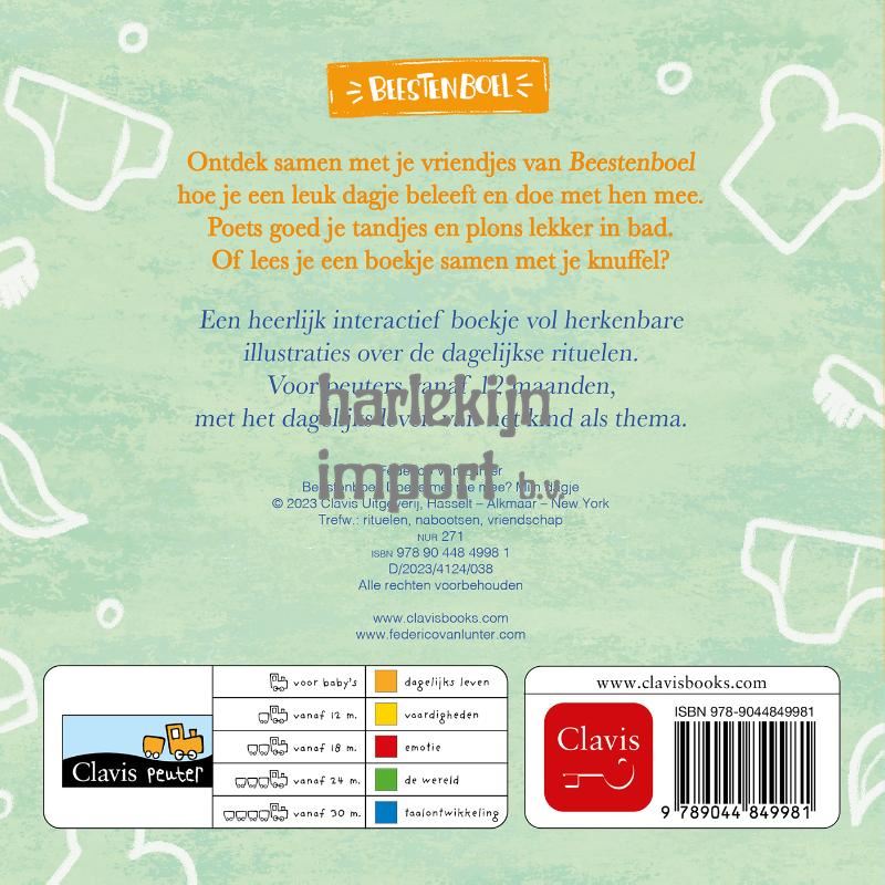 Ontdek samen met je vriendjes van Beestenboel hoe je een leuk dagje beleeft en doe met hen mee. Poets goed je tandjes en plons lekker in je bad. Of lees je een boekje samen met je knuffel? Een heerlijk interactief boekje vol herkenbare illustraties over de dagelijkse rituelen. Voor peuters vanaf 12 maanden, met het dagelijks leven van het kind als thema.
