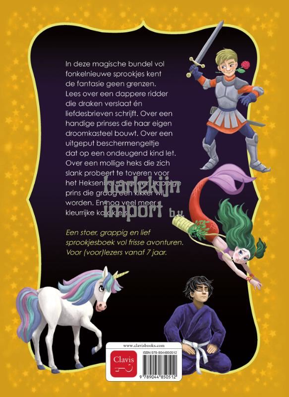 In deze magische bundel vol fonkelnieuwe sprookjes kent de fantasie geen grenzen. Lees over een dappere ridder die draken verslaat én liefdesbrieven schrijft. Over een handige prinses die haar eigen droomkasteel bouwt. Over een uitgeput beschermengeltje dat op een ondeugend kind let. Over een mollige heks die zich slank probeert te toveren voor het Heksenbal. Over een koppige prins die graag een kikker wil worden. En nog veel meer kleurrijke karakters … Een stoer, grappig en lief sprookjesboek vol frisse avonturen. Voor (voor)lezers vanaf 7 jaar.