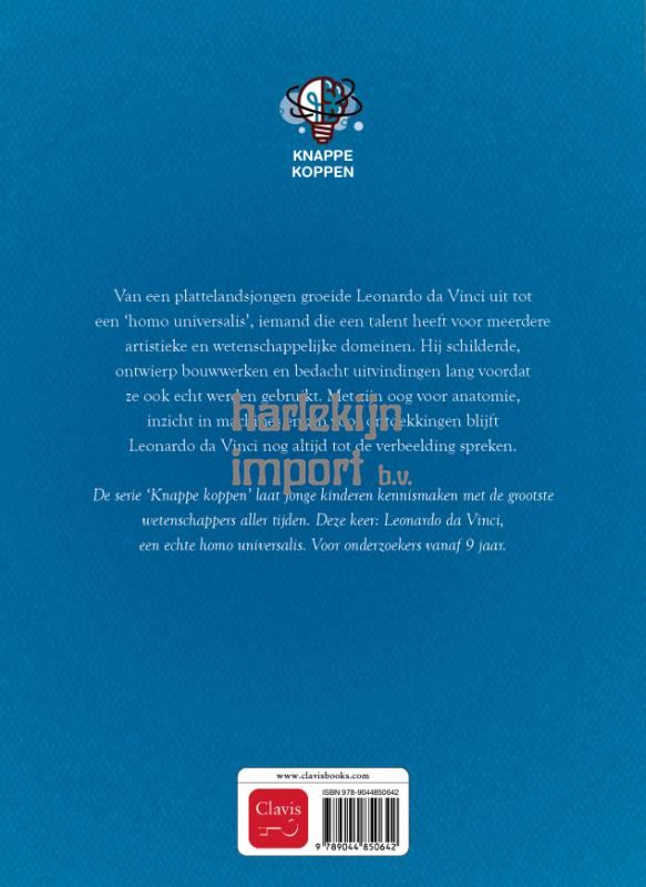 Van een plattelandsjongen groeide Leonardo da Vinci uit tot een wereldberoemd schilder. Maar wist je dat het Florentijnse genie daartussen nog zoveel meer heeft gedaan? De parachute, de helikopter, de tank, verplaatsbare bruggen … Al die uitvindingen deed hij nog lang voordat ze ook echt werden gebruikt. Met zijn oog voor anatomie, inzicht in machines en zin voor ontdekkingen blijft Leonardo da Vinci nog altijd tot de verbeelding spreken De serie ‘Knappe koppen’ laat jonge kinderen kennismaken met de grootste wetenschappers aller tijden. Deze keer: Leonardo da Vinci, een echte homo universalis. Voor onderzoekers vanaf 9 jaar.