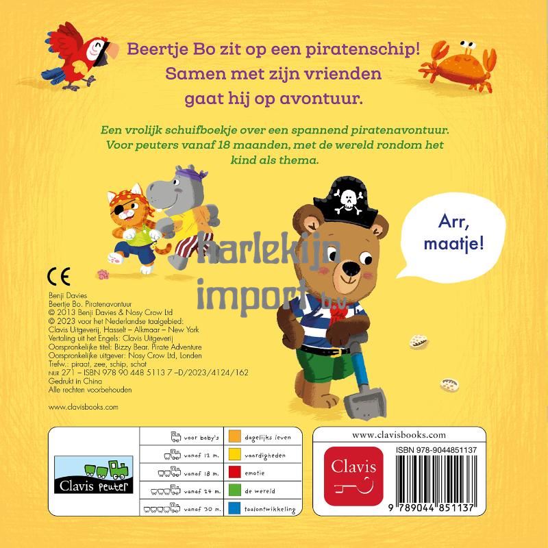 Beertje Bo zit op een piratenschip! Samen met zijn vrienden gaat hij op avontuur. Een vrolijk schuifboekje over een spannend piratenavontuur. Voor peuters vanaf 18 maanden, met de wereld rondom het kind als thema.