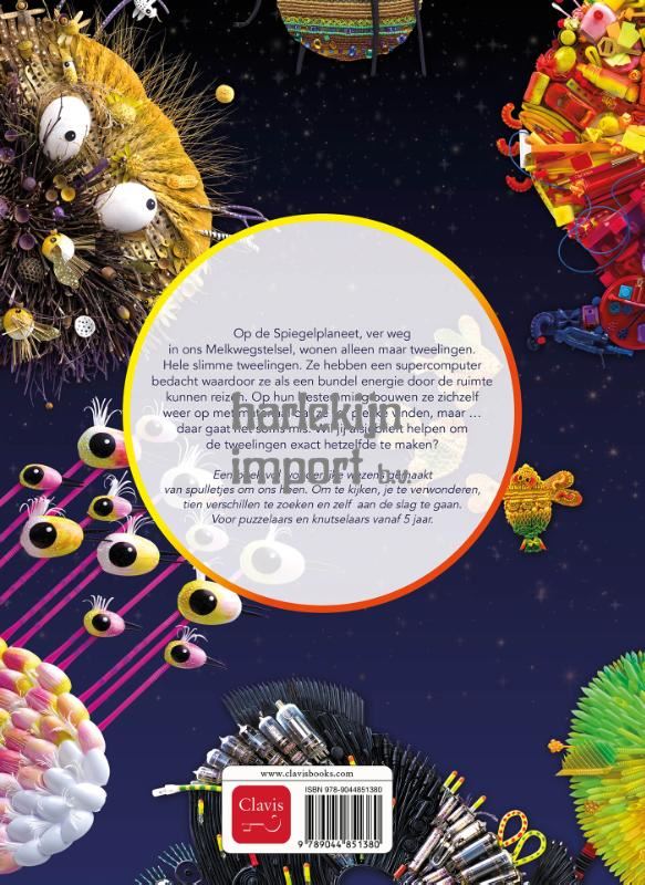 Ver weg in ons Melkwegstelsel vind je de Spiegelplaneet. Alle bewoners van deze planeet zijn tweelingen. Wat zien ze er bijzonder uit! En ze zijn superslim, slimmer dan jij en ik. Ze hebben een supercomputer bedacht waardoor ze als een bundel energie door de ruimte kunnen reizen, tot in de verste uithoeken! Op hun bestemming moeten ze zichzelf weer opbouwen met materiaal dat ze ter plekke vinden, maar … daar gaat het soms mis. Wil jij alsjeblieft helpen om de tweelingen weer exact hetzelfde te maken? Een boek vol wonderlijke wezens gemaakt van spulletjes om ons heen. Om te kijken, je te verwonderen, tien verschillen te zoeken en zelf aan de slag te gaan. Voor puzzelaars en knutselaars vanaf 5 jaar.