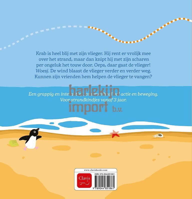 Krab is heel blij met zijn vlieger. Hij rent er vrolijk mee over het strand, maar dan knipt hij met zijn scharen per ongeluk het touw door. Oeps, daar gaat de vlieger! Woesj. De wind blaast de vlieger verder en verder weg. Kunnen zijn vrienden hem helpen de vlieger te vangen? Een grappig en interactief zomerverhaal vol actie en beweging. Voor strandkindjes vanaf 3 jaar.