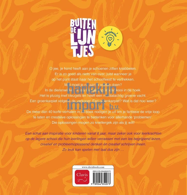 O jee, je hond heeft aan je schoenen zitten knabbelen. Er is zo goed als niets van over, juist wanneer je op het punt staat naar het schoolfeest te vertrekken. Wat moet je nu aan je voeten doen? In de dierenwinkel zit iets weggestopt in een kooi in de hoek. Het is pluizig met vleugels en heeft een metaalachtig groene vacht. Een groenkarpiet volgens de verkoper. Een groenkarpiet? Wat is dat nou weer? De meer dan 40 korte verhalen in dit boek nodigen je uit om je fantasie de vrije loop te laten en creatieve oplossingen te bedenken voor allerhande ‘problemen’. Die oplossingen mogen zo knettergek zijn als jij wilt! Een schat aan inspiratie voor kinderen vanaf 6 jaar, maar zeker ook voor leerkrachten op de lagere school die hun leerlingen willen verrassen met een les begrijpend lezen, creatief en probleemoplossend denken én creatief schrijven ineen. Zo leuk kan spelen met taal dus zijn …