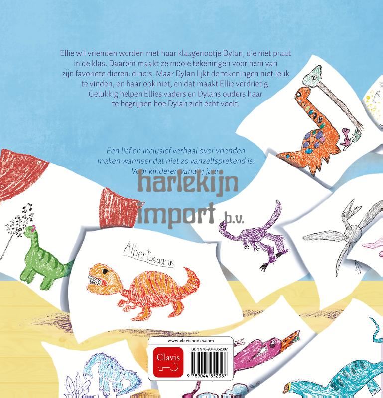 Ellie wil vrienden worden met haar klasgenootje Dylan, die niet praat in de klas. Daarom maakt ze mooie tekeningen voor hem van zijn favoriete dieren: dino’s. Maar Dylan lijkt de tekeningen niet leuk te vinden, en haar ook niet, en dat maakt Ellie verdrietig. Gelukkig helpen Ellies vaders en Dylans ouders haar te begrijpen hoe Dylan zich écht voelt. Een lief en inclusief verhaal over vrienden maken wanneer dat niet zo vanzelfsprekend is. Voor kinderen vanaf 4 jaar.