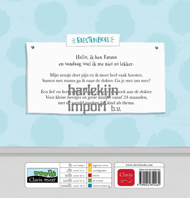 Hallo, ik ben Emma en vandaag voel ik me niet zo lekker. Mijn neusje doet pijn en ik moet heel vaak hoesten. Samen met mama ga ik naar de dokter. Ga je met ons mee? Een lief en herkenbaar boekje over een bezoek aan de dokter. Voor kleine beestjes en grote kindjes vanaf 24 maanden, met de wereld rondom het kind als thema.