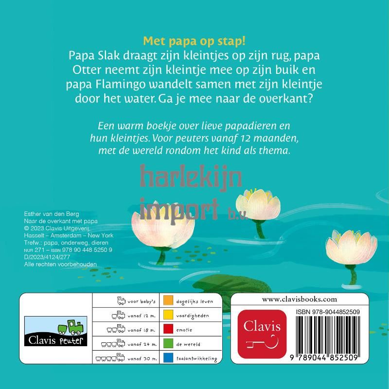 Met papa op stap! Papa Slak draagt zijn kleintjes op zijn rug, papa Olifant neemt zijn kleintje mee aan zijn staart en Papa Flamingo wandelt samen met zijn kleintje door het water. Ga je mee naar de overkant? Een warm boekje over lieve papa’s in de dierenwereld. Voor peuters vanaf 12 maanden, met het dagelijks leven van het kind als thema.