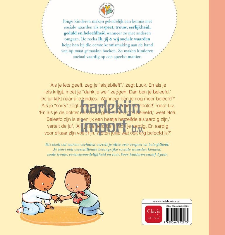 Jonge kinderen maken geleidelijk aan kennis met sociale waarden als respect, trouw, eerlijkheid, geduld en beleefdheid wanneer ze met anderen omgaan. De reeks Ik, jij & wij sociale waarden helpt hen bij die eerste kennismaking aan de hand van op maat gemaakte boeken. Ze maken kinderen sociaal vaardig op een speelse manier. ?Als je iets geeft, zeg je “alsjeblieft”,’ zegt Luuk. En als je iets krijgt, moet je “dank je wel” zeggen. Dan ben je beleefd.’ De juf kijkt naar alle kindjes. ‘Wanneer ben je nog meer beleefd?’ ‘Als je ‘sorry’ zegt wanneer je tegen iemand aanbotst!’ roept Liv. ‘En als je de dokter een handje geeft. Dat is ook beleefd,’ weet Noa. ‘Beleefd zijn is eigenlijk een beetje hetzelfde als aardig zijn,’ vertelt de juf. ‘Als je beleefd bent, doe je aardig. En aardig voor elkaar zijn voelt fijn. Weten jullie wat ook erg beleefd is? Dit boek vol warme verhalen vertelt je alles over respect en beleefdheid. Je leert ook verschillende belangrijke sociale waarden kennen, zoals trouw, verantwoordelijkheid en tact. Voor kinderen vanaf 4 jaar.