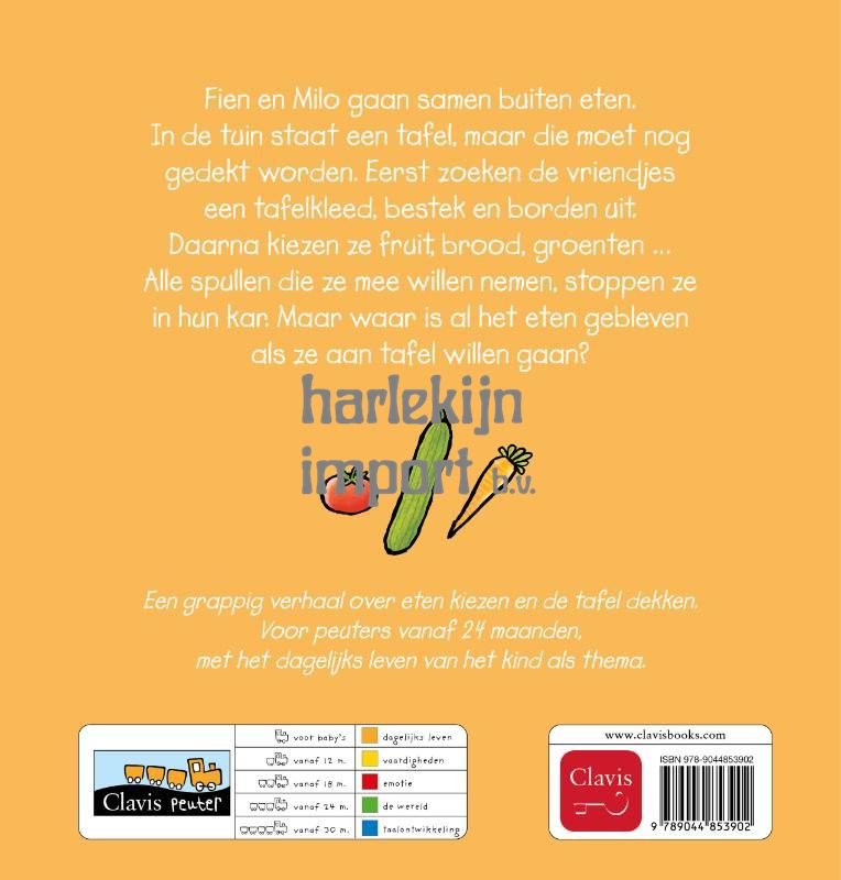 Fien en Milo gaan samen buiten eten. In de tuin staat een tafel, maar die moet nog gedekt worden. Eerst zoeken de vriendjes een tafelkleed, bestek en borden uit. Daarna kiezen ze fruit, brood, groenten … Alle spullen die ze mee willen nemen, stoppen ze in hun kar. Maar waar is al het eten gebleven als ze aan tafel willen gaan? Een grappig verhaal over eten kiezen en de tafel dekken. Voor peuters vanaf 24 maanden, met het dagelijks leven van het kind als thema.