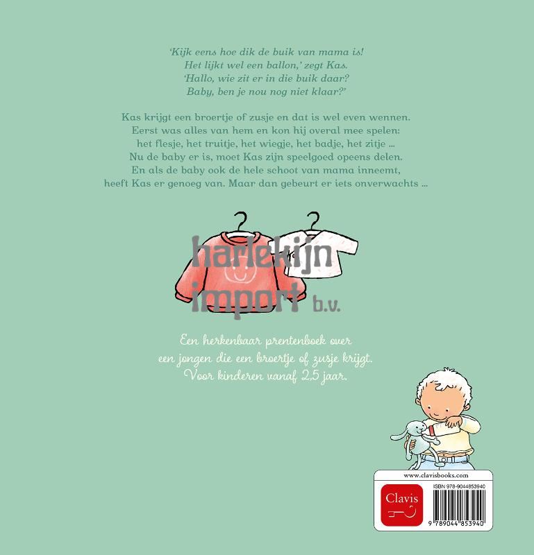 ‘Kijk eens hoe dik de buik van mama is! Het lijkt wel een ballon,’ zegt Kas. ‘Hallo, wie zit er in die buik daar? Baby, ben je nou nog niet klaar?’ Kas krijgt een broertje of zusje en dat is wel even wennen. Eerst was alles van hem en kon hij overal mee spelen: het flesje, het truitje, het wiegje, het badje, het zitje … Nu de baby er is, moet Kas zijn speelgoed opeens delen. En als de baby ook de hele schoot van mama inneemt, heeft Kas er genoeg van. Maar dan gebeurt er iets onverwachts … Een herkenbaar prentenboek over een jongen die een broertje of zusje krijgt. Voor kinderen vanaf 2,5 jaar.