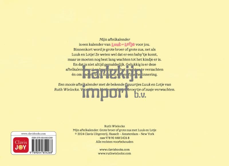 Mijn aftelkalender is een kalender van Luuk en Lotje voor jou. Binnenkort word je grote broer of grote zus, net als Luuk en Lotje! Ze weten wel dat er een baby’tje komt, maar ze moeten nog best lang wachten tot het kindje er is. En dat is niet altijd gemakkelijk. Gelukkig is er deze aftelkalender vol opdrachten om het wachten te verzachten én om nadien bij te houden als een fijne herinnering. Een mooie aftelkalender met de bekende figuurtjes Luuk en Lotje van Ruth Wielockx. Voor kleine kinderen die een broertje of zusje verwachten.