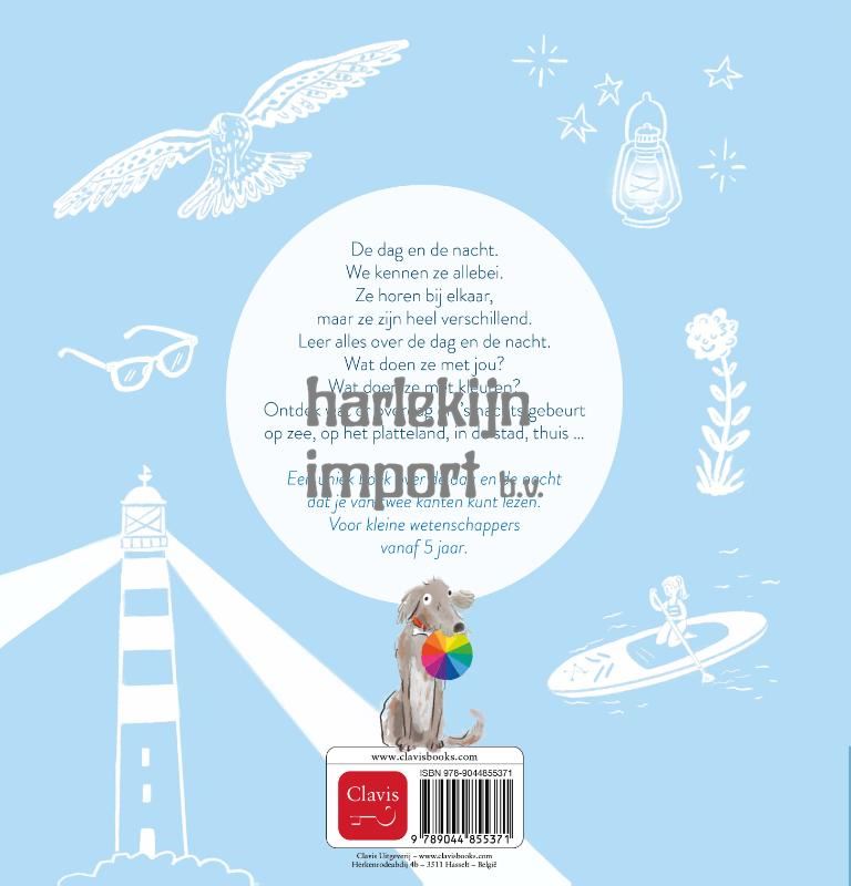 De dag en de nacht. We kennen ze allebei. Ze horen bij elkaar, maar ze zijn heel verschillend. Leer alles over de dag en de nacht. Wat doen ze met jou? Wat doen ze met kleuren? Ontdek wat er overdag en ’s nachts gebeurt op zee, op het platteland, in de stad, thuis … Een uniek boek over de dag en de nacht dat je van twee kanten kunt lezen. Voor kleine wetenschappers vanaf 5 jaar.