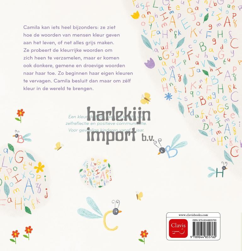 Camila kan iets heel bijzonders: ze ziet hoe de woorden van mensen kleur geven aan het leven, of net alles grijs maken. Ze probeert de kleurrijke woorden om zich heen te verzamelen, maar er komen ook donkere, gemene en droevige woorden naar haar toe. Zo beginnen haar eigen kleuren te vervagen. Camila besluit dan maar om zélf kleur in de wereld te brengen. Een kleurrijk boek over de kracht van zelfreflectie en positieve communicatie. Voor gevoelige kinderen vanaf 5 jaar.