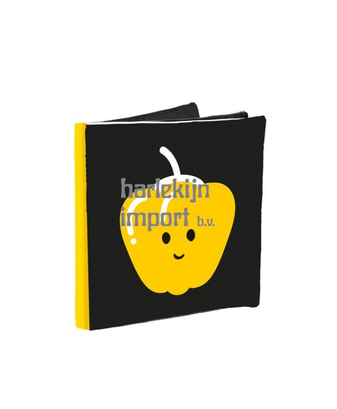 Een knisperboekje in zwart-wit, met vrolijke kleuraccenten voor baby’s.