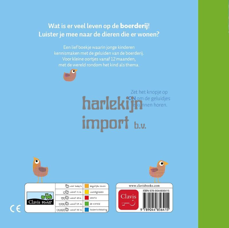 Wat is er veel leven op de boerderij! Luister je mee naar de dieren die er wonen? Een lief boekje waarin jonge kinderen kennismaken met de geluiden van de boerderij. Voor kleine oortjes vanaf 12 maanden, met de wereld rondom het kind als thema.