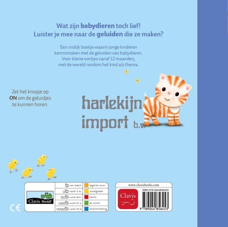 Wat zijn babydiertjes toch lief! Luister je mee naar de geluidjes die ze maken? Een vrolijk boekje waarin jonge kinderen kennismaken met de geluiden van babydieren. Voor kleine oortjes vanaf 12 maanden, met de wereld rondom het kind als thema.